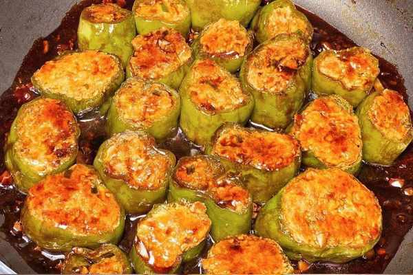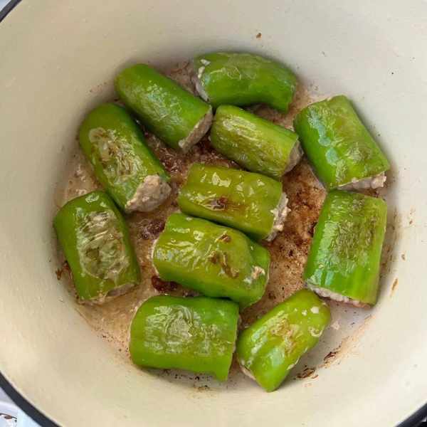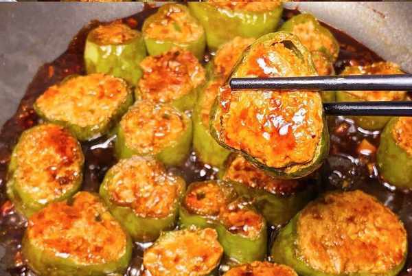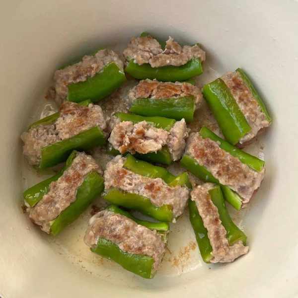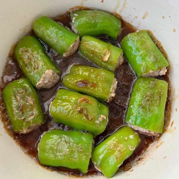 4. 锅里倒油,肉沫面朝下煎至焦黄,翻面将辣椒煎至虎皮色,再次翻面让肉沫面朝下,加入酱汁,小火煮至沸腾收汁即可。