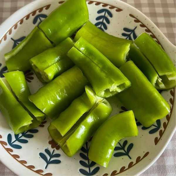 塞肉方法一:青椒切成长端并在一边破开,从开口处塞入肉馅。