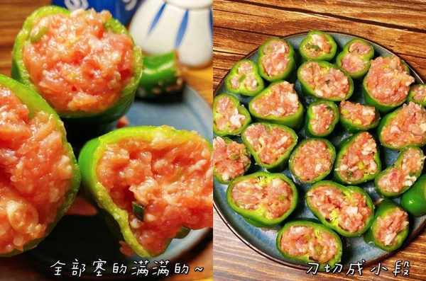 塞肉方法二:直接从青椒头部塞入肉馅,塞满后,再将青椒切成小段。
