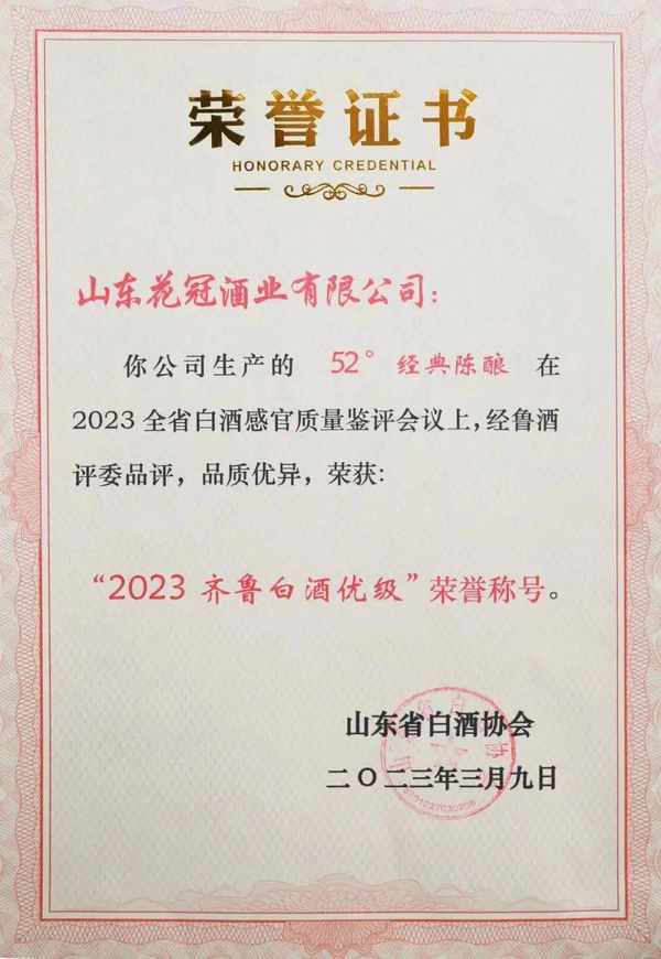 近日,在山东省白酒协会主办的2023年山东省白酒感官质量鉴评大会上,山东花冠酒业参评的花之冠52度牡丹仙子酒、冠群芳52度经典陈酿两款产品在众多竞品中脱颖而出,一举摘得“2023齐鲁白酒酒体设计金奖”、“2023齐鲁白酒优级”两项大奖。