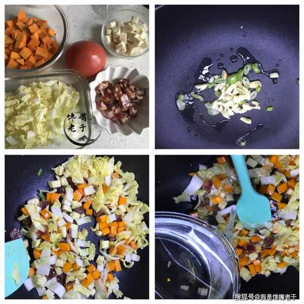 食材:大米、腊肠、西红柿、娃娃菜、春笋、南瓜、小葱、生抽、蚝油、盐