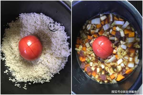 步骤三:大米淘洗2遍后放入电饭锅中,中间放入洗净的西红柿,在西红柿的顶端切一个十字花刀,然后把煮好的菜,连同汤汁一起倒入电饭锅中,最后按煮饭键即可。