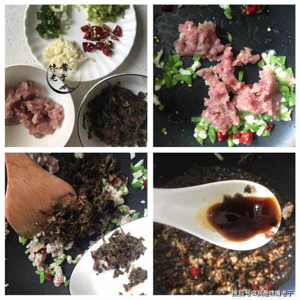 步骤二:热锅凉油,先放入肉丁煸炒至变色后放入葱花、蒜碎以及辣椒,炒出香味后放入梅干菜,接着再放入1茶匙生抽、半茶匙香醋,半茶匙蚝油以及少许的盐,最后再加上2大勺清水。