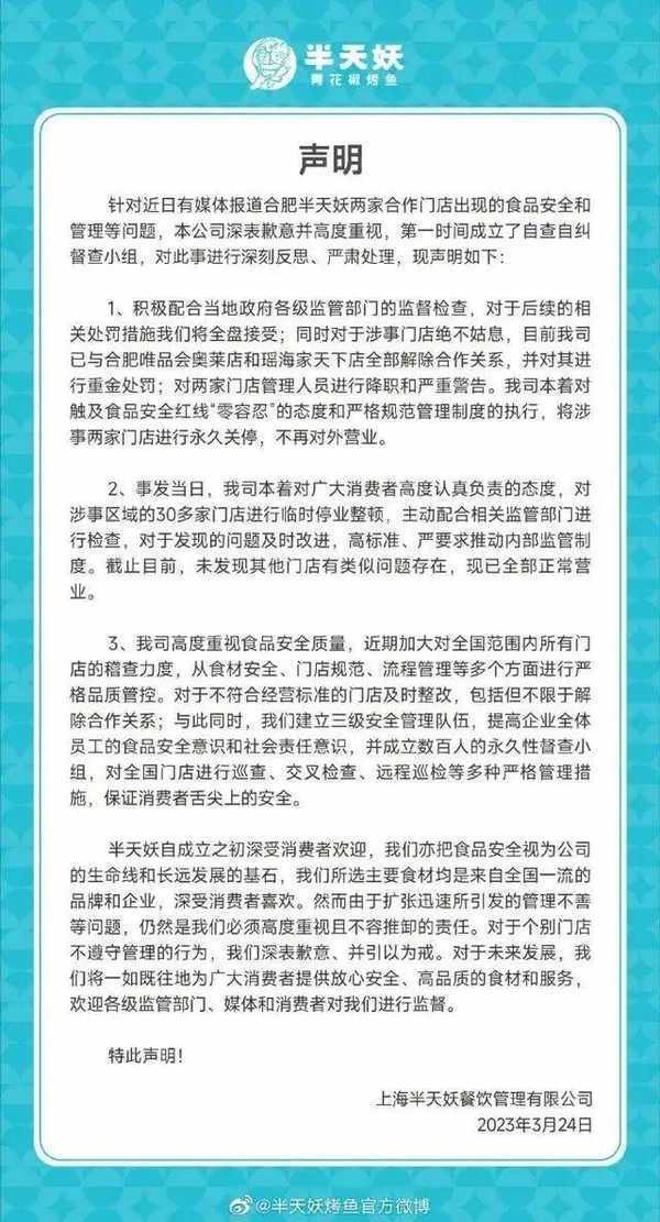 3月24日,针对“安徽合肥两家门店出现食品安全问题”一事,半天妖烤鱼官方微博发布声明,我司本着对触及食品安全红线“零容忍”的态度和严格规范管理制度的执行, 将涉事两家门店进行永久关停,不再对外营业。