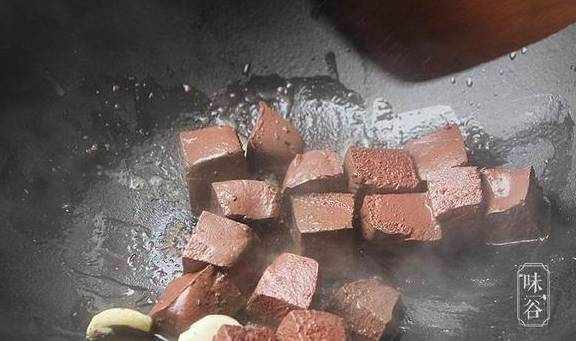 3、锅内放油,爆香蒜瓣后把猪红倒进去翻炒几下,炒到猪血有点变色;
