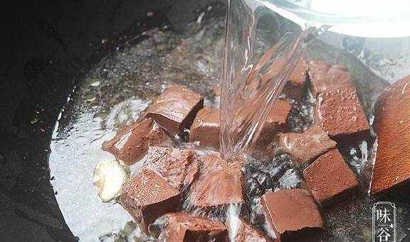 4、倒入适量水,水量差不多和猪红平齐,水开后煮2分钟左右;