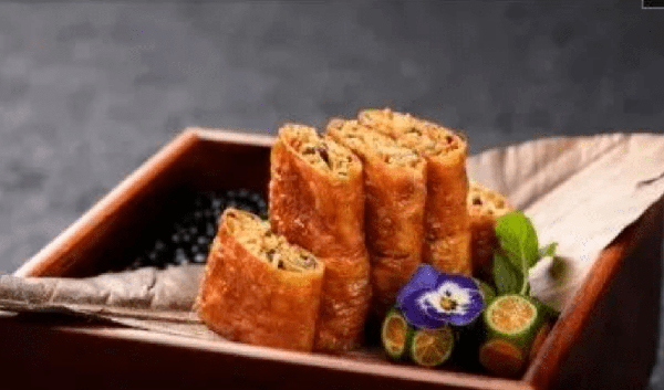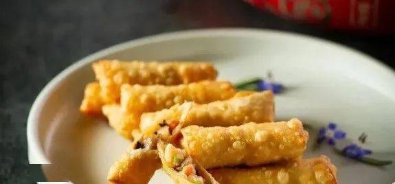 3、将春饼皮平铺,放入馅料卷好,用鸡蛋液封口,下五成热油炸至金黄、表皮起泡,沥油后码盘即可。