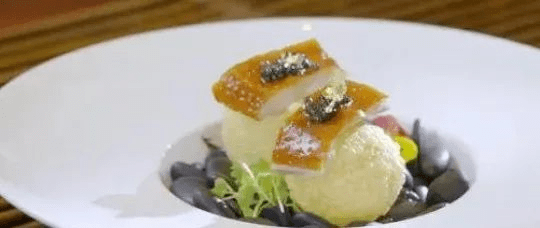 3、鸡放进烧炉里要反复烧3次。第一次烧20分钟,取出,再刷第2遍脆皮水放进烤炉烧5分钟,最后刷第3遍脆皮水再改大火烧3分钟。烧好的杏花鸡斩件,搭配少许鱼子酱、食用金箔,还有蛋黄柠檬酱作馅料的小麦球即可。