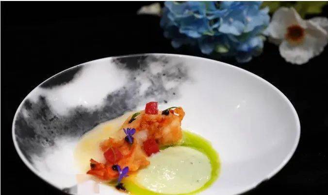 6、将虾摆在碟中间,橙汁泡沫淋在虾后面,再将菠菜汁淋在前面,点上西汁,摆上西瓜粒,点缀花草,即成。