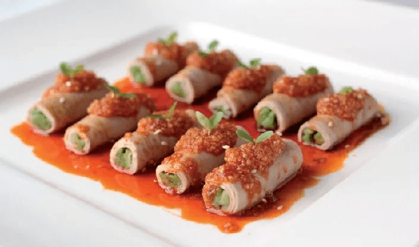 2、将卷好的腰片装盘,用盐,蒜泥,白糖,鸡汁,美极鲜,生抽,红油,白胡椒粉,芝麻油,熟芝麻等调成蒜泥汁,淋在腰片卷上。