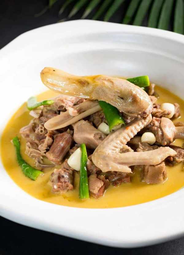2、起锅将鸭肉焯水去掉血沫,另起锅下入菜籽油,下入鸭肉煸炒出干香,下入高汤、调料,转入高压锅上汽12分钟,然后将辅料选出备用。