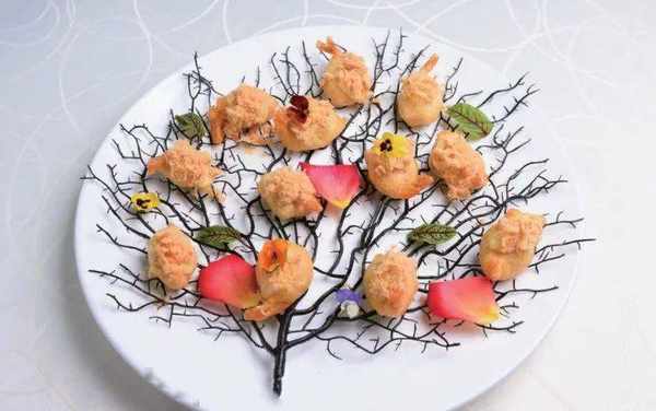 2.虾肉打虾饺,酿入荔枝,虾尾插入荔枝 露出凤尾;