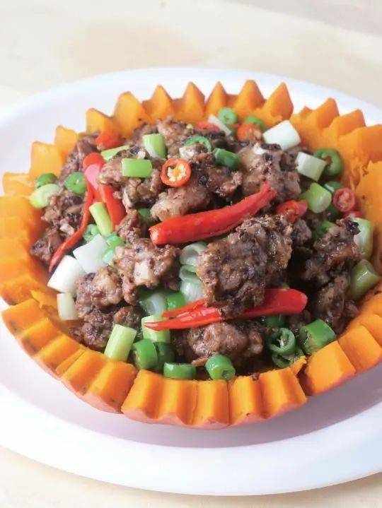 2.把排骨段加炒好的豉汁、生抽、蚝油、鸡汁、味精、生粉、花生油拌匀腌制入味,放竹笼里码好,上大火蒸约20分钟至熟,取出来装入蒸熟的金瓜盅里,撒上葱颗、青椒粒、红椒粒点缀,即成。