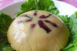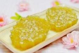 23.冷藏凝固的豌豆糕倒扣在案板上,切割成块,金黄的糕上点缀着褐色柿饼,诱人口水。吃一口,沁凉,绵甜,入口即化,爽爽的