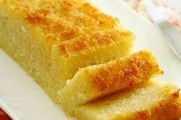 3.在大盆里放入木薯蓉、椰奶、中筋面粉、玉米粉、盐、香兰精,搅拌均匀。把蛋打散成蛋汁加入拌匀,最后加入椰糖水拌匀,倒入烤盘里,入炉烘烤1小时15分钟(直到按压表面感觉组织结实即可)。