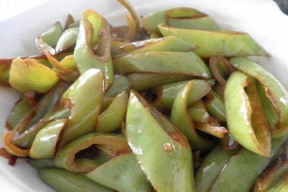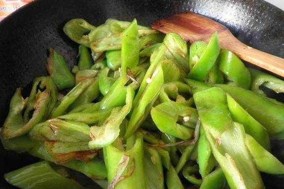 3,再倒入兑好的糖醋汁,炒至尖椒变软,撒少许盐翻匀即可。