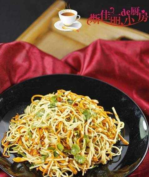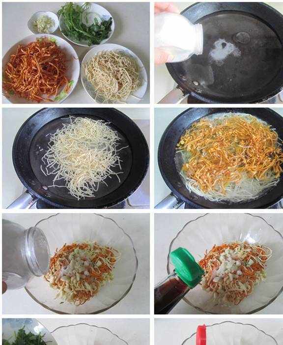 制作:1.准备好原材料;2烧锅开水,加入几滴油和适量的盐;3.先放入干丝进去焯;4.再放入虫草花进去焯一下后,捞出后备用;5.将炒好的虫草花和干丝放入碗中,加入蒜、盐、胡椒粉;6.加入少许生抽和香醋;7.放入香菜末;8.最后放入芝麻香油;