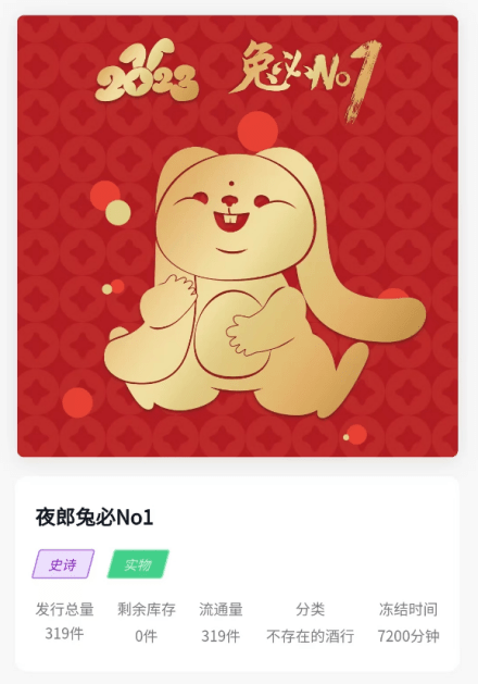 3月19日夜郎古酒联合普鸽版权市场推出的文创IP酒数字藏品频道“不存在的酒行”发行了首款数字酱酒藏品《夜郎兔必No.1》以夜郎古作为主题创造IP夜郎兔,以中国传统生肖文化为基点,将类卯兔通过生动萌化处理后创造而成,形象萌动,朝气蓬勃,结合科技数字化表达出来,寓意对人们的美好生活祝愿与期盼。并且与实物酒夜郎春秋定制版作为藏品的价值拖底,共计发行319份,售价319元。据悉,该藏品在未来将会以本“夜郎兔”藏品作为创作蓝本发行贯穿全年的主题藏品,并且将会深度与实体白酒绑定进行双向赋能。