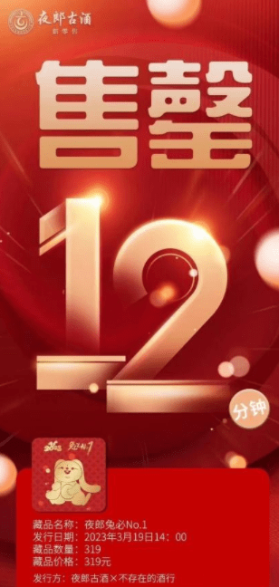 导读:3月19日夜郎古与普鸽版权市场联合推出的文创IP酒频道“不存在的酒行”发行了首款数字酱酒藏品《夜郎兔必No.1》,以数字藏品应用场景为切入点探索酱酒消费新场景,发行仅仅12分钟售罄,首战告捷。