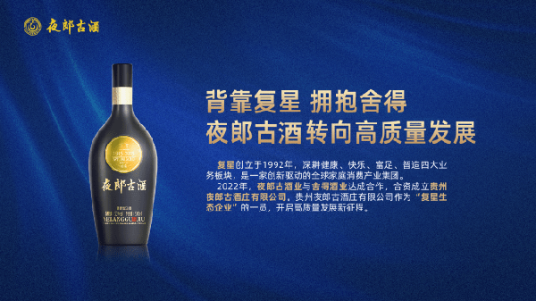 2022年携手世界500强企业复星集团强强联手,深度布局酱酒。复星旗下舍得酒业与夜郎古酒业成立合资公司。标志着夜郎古酒业品牌化、全国化步伐迈出了高质量发展的关键一步,实现从仁怀名酒到全国性名酒的转变。