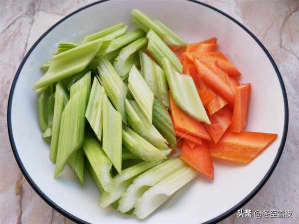 2.芹菜摘去叶子,洗净,斜刀切成段,胡萝卜切成菱形片。