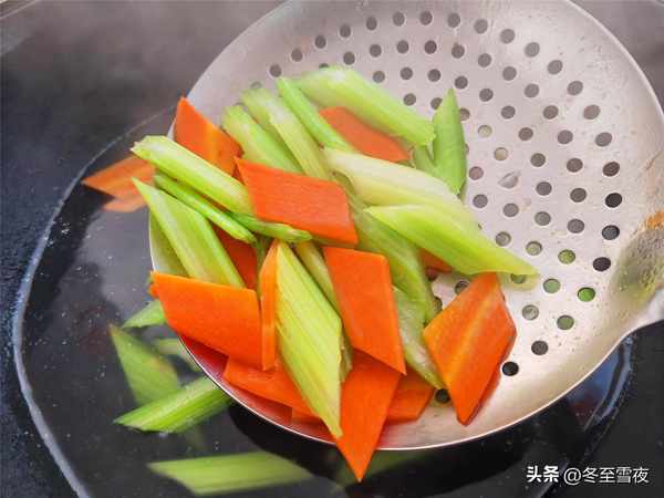 5.将芹菜,山药,胡萝卜片,一起捞出,沥净水分待用。