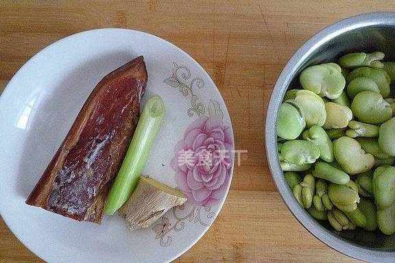 大米250克、腊肉100克、蚕豆150克、葱适量、料酒1茶匙、生抽/食盐/姜适量。