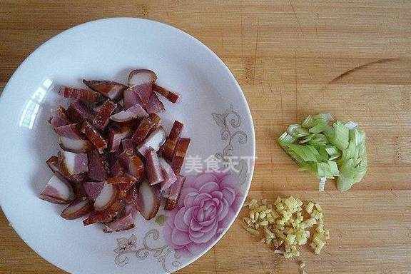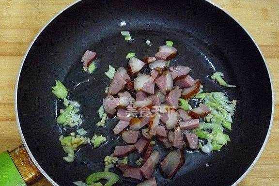 4.锅中放两茶匙食用油,放入葱姜末爆香放入切好的腊肉丁煸炒至腊肉白色部分变透明。