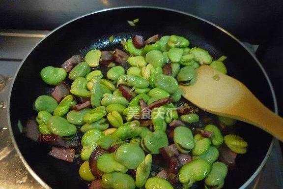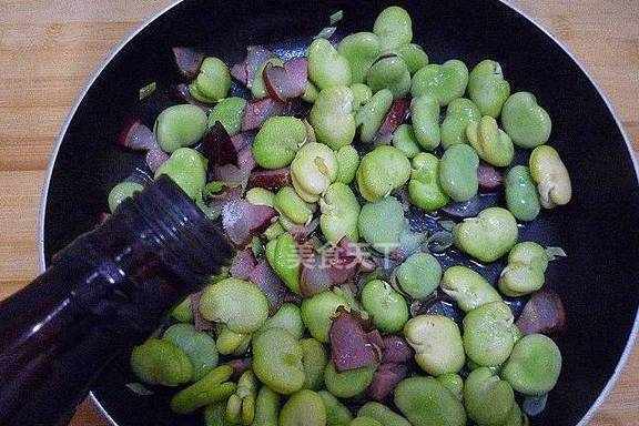 5.加入蚕豆,加入食盐。沿锅边烹入料酒,加入生抽。