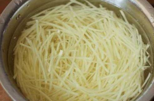 把土豆丝放入水中浸泡10来分钟,把土豆里面的淀粉浸泡出了,这样炒出来的土豆丝就没那么粉了,且不粘锅。