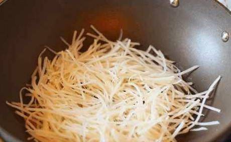 接下来把辣椒切碎,用油把切好的辣椒炸香,然后放入切好的土豆丝
