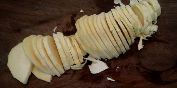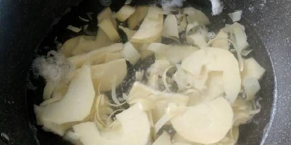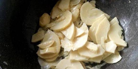 做法:春笋剥去外壳,去掉根部跟老的地方,然后清洗干净切片。