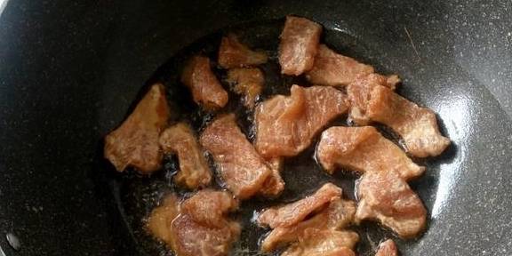 锅中倒入油,油热后,放入腌制好的猪肉,煮至7成熟,盛出备用。