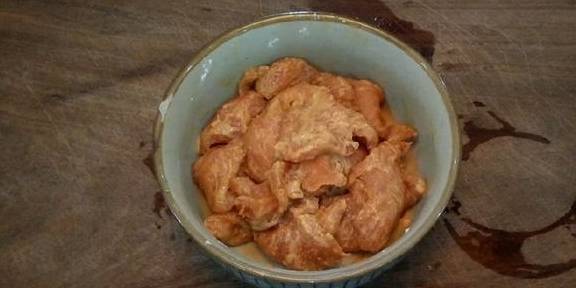 里脊肉切成薄片,加入生抽,盐,料酒,胡椒粉,鸡精搅拌均匀,然后加入地瓜粉,使地瓜粉均匀的裹上猪肉,抓均匀后腌制10分钟。