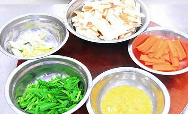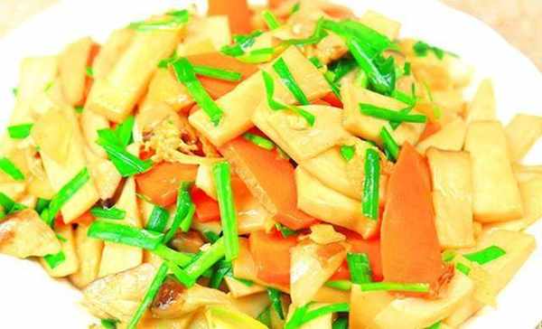 4.锅内再烧油,放入葱姜爆香,倒入焯过水的杏鲍菇和胡萝卜快速翻炒均匀,再倒入鸡蛋和韭菜,加入食盐2克、蚝油5克、生抽5克调味,翻炒入味后即可装盘上桌。