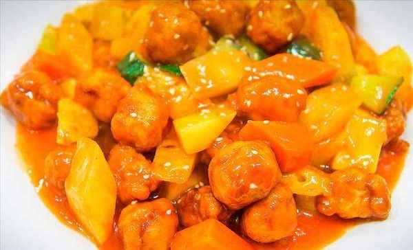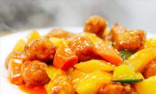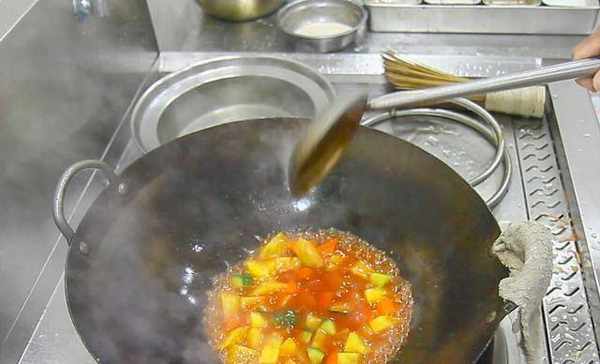 5.勾入水淀粉,汤汁变得粘稠,起泡的时候,倒入菠萝、黄瓜、胡萝卜,翻炒一会后,倒入肉丁翻炒。当肉丁裹满汤汁时,开大火,最后收汁。