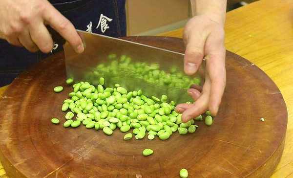 再准备一碗蚕豆,用刀轧碎,也不要太碎。留一些粗颗粒在里面,吃起来更有滋味。切好以后放入盆中,打入两个鸡蛋,加入食盐、味精、十三香、少来一点胡椒粉。