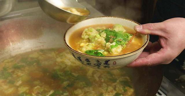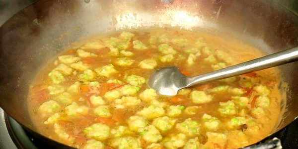 3.汤汁烧开以后,我们开始蚕豆丸子。抓一把馅料,在虎口处挤成丸子放入锅中。水不要过于沸腾,让丸子在锅中慢慢定型。下丸子的时候要经常摇晃锅,以免糊底。