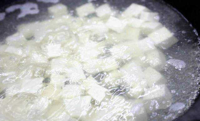 2.煮一下豆腐。烧半锅开水,把豆腐倒进去,汆煮一下去去豆腥味。煮好后倒出来,快速过一下凉水,这样口感更加的爽滑。