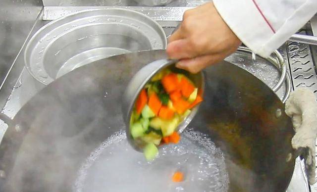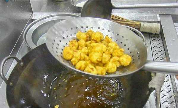 油温7成热时,把捞出的肉丁倒入复炸。20秒左右捞出控油。