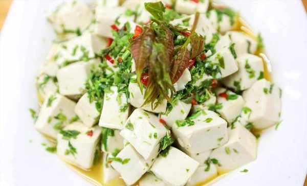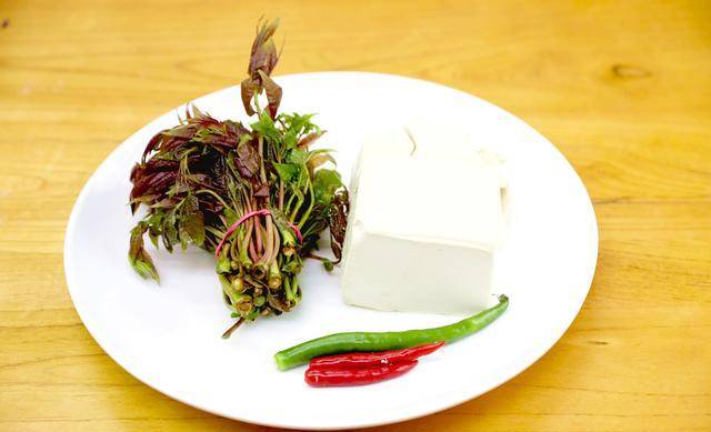 1.准备食材。一块嫩豆腐,切成1厘米见方的豆腐块,切的时候要轻一点,不然容易碎。香椿焯烫一下再食用。