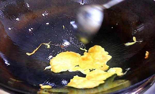 3.热锅凉油倒入蛋液,煎至蛋液全部定型,用勺子打散,倒出来备用。