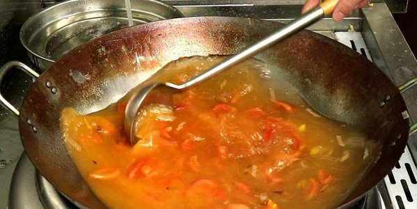 4.锅内留底油,加入一勺番茄酱,用勺子炒散。加入一勺清水,倒入白糖(20克),加入20克的白醋。勺子不停的搅拌,化开白糖后,加入少量的食盐。