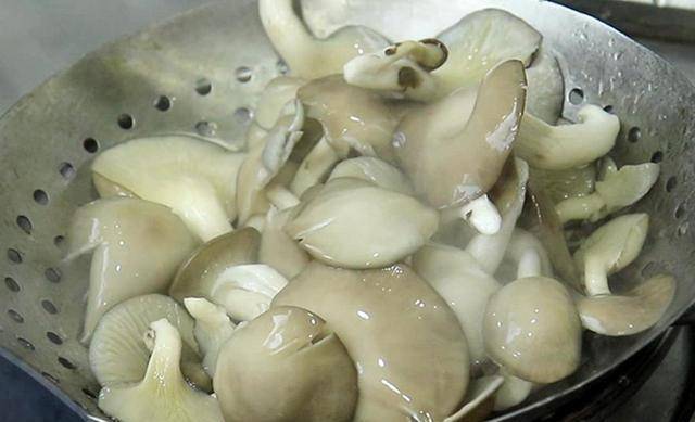 2.锅内烧水,加入少许食盐和鸡粉,放入一点植物油,水烧开后放入平菇,焯水1分钟左右,平菇变软以后倒出,用清水冲洗干净。