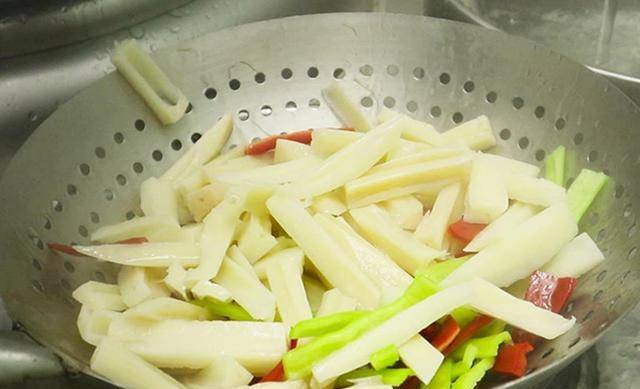 3.锅内烧水,加入一点白醋和植物油,水烧开以后倒入莲藕和青红椒,汆煮2分钟左右,莲藕断生后倒出,用清水冲洗降温,保持清脆。