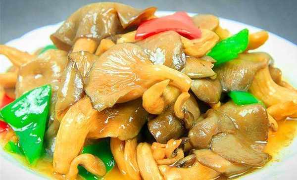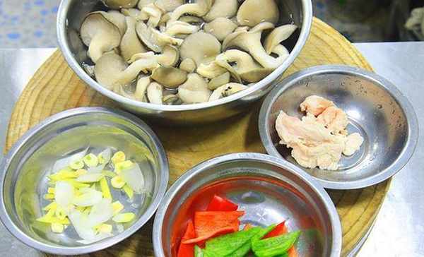 4.从锅边淋入一点清水,加入食盐2克,鸡粉2克,一点料酒去腥,倒入青红椒和平菇,翻炒至青红椒断生,勾入少许水淀粉便于入味,淋上明油提亮色泽,翻匀后美味即成。