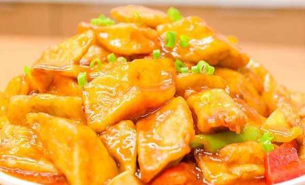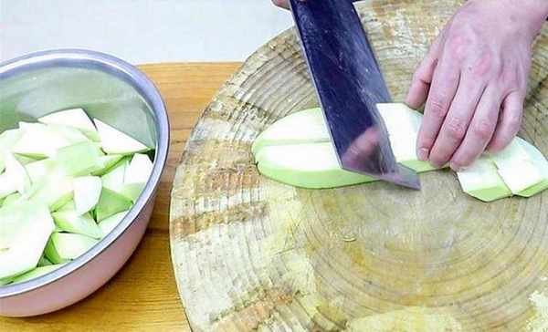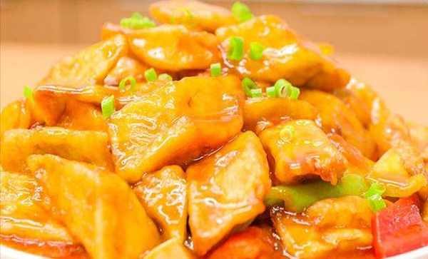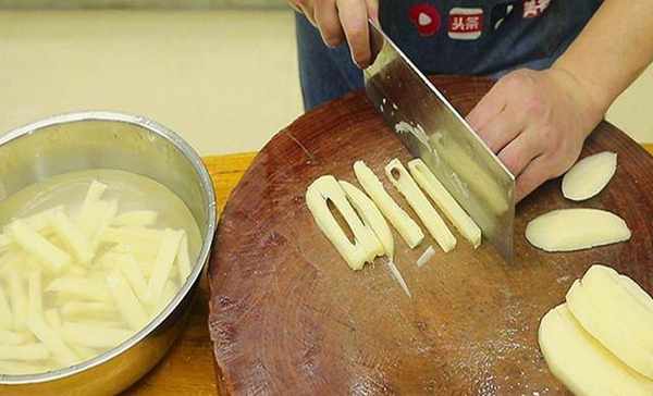 3.锅内烧油,五成油温下入茄子,定型以后再搅动,大约炸1分钟,茄子面酥黄以后捞出来,升高油温至六成热,放入茄子复炸10秒钟捞出,这样吃起来外焦里软。