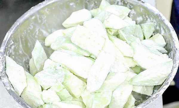 2.茄子泡好以后捞出,撒上淀粉拌匀,避免炸的时候吸入过多油脂。