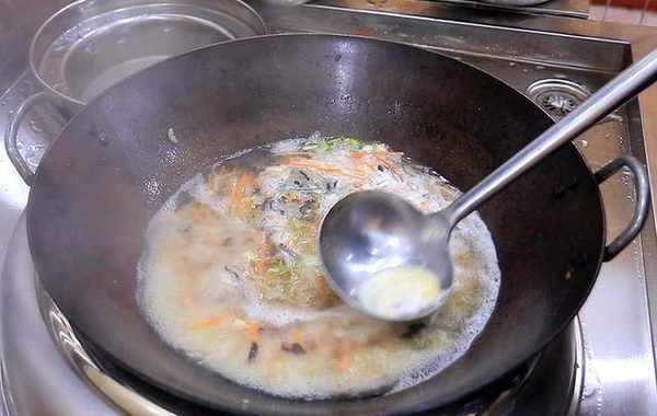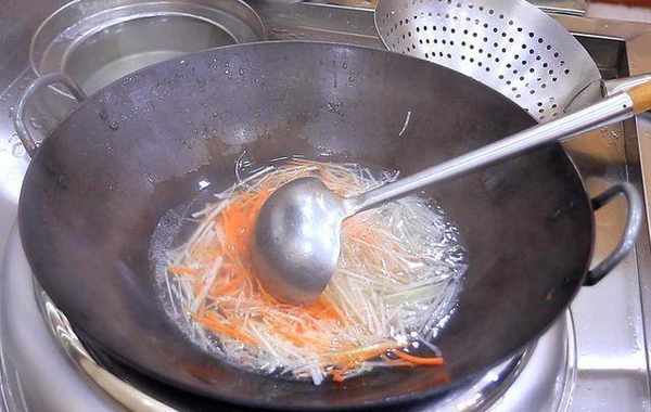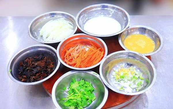 1.把木耳放入清水中浸泡1个小时,泡软以后捞出来切碎;冬瓜一块,去除瓜皮和瓜瓤,切成细丝;胡萝卜半根也切成细丝;火腿一根切成细丝;另外切一点葱花、香菜段备用。