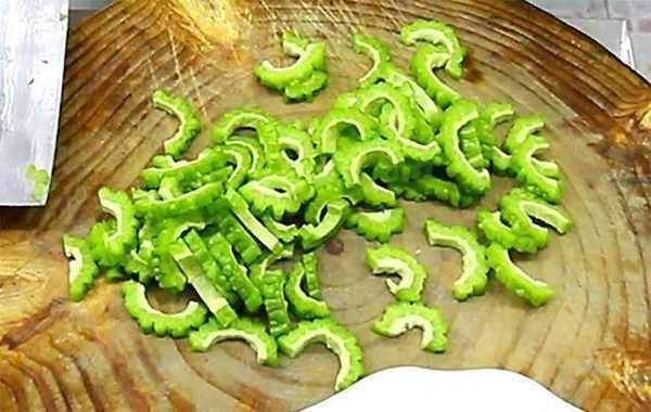 1.准备苦瓜一根,从中竖切成两半,用勺子挖去中间的苦瓜瓤,再将苦瓜切片放入盘中备用。